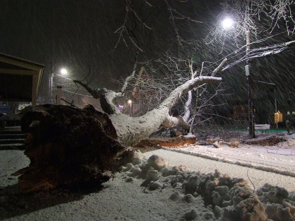 The village was quiet, with few people about, when the tree fell down, but town road crews, police and electrical linemen were arrived quickly, and eventually a few curious onlookers followed, murmuring and taking pictures.